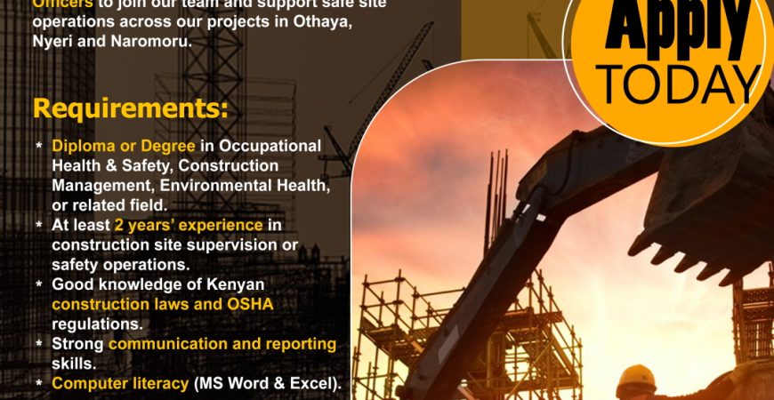 We are seeking 3 qualified Construction Safety Officers to join our team and support safe site operations across our projects in Othaya, Nyeri and Naromoru.
